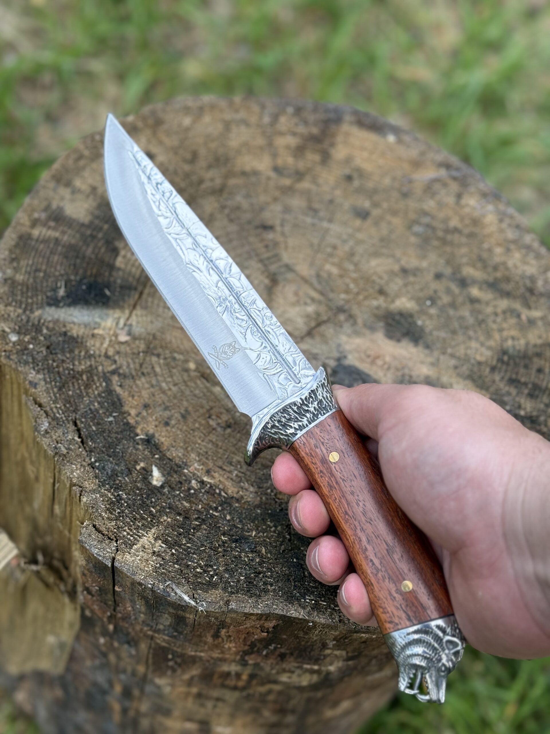 Потужна рукоятка зручно лежить у руці та забезпечує комфортний хват ножа. Її прикрашає невелика гарда, на обоймі якої розташований унікальний круговий орнамент. Наверши рукоятки зображує виразний портрет голови вовка, виконана з металу.
