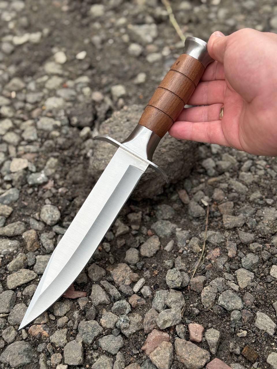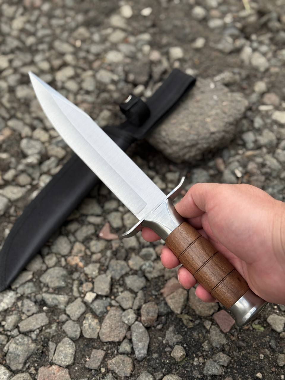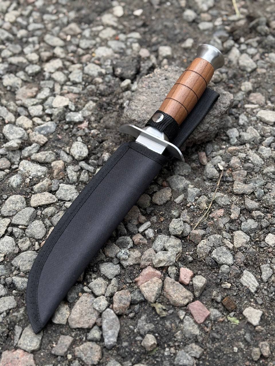-Товстий у обусі клинок, витримує великі поперечні навантаження. У комплекті посилені піхви з вологовідштовхувальним покриттям прошитими особливо міцними нитками.