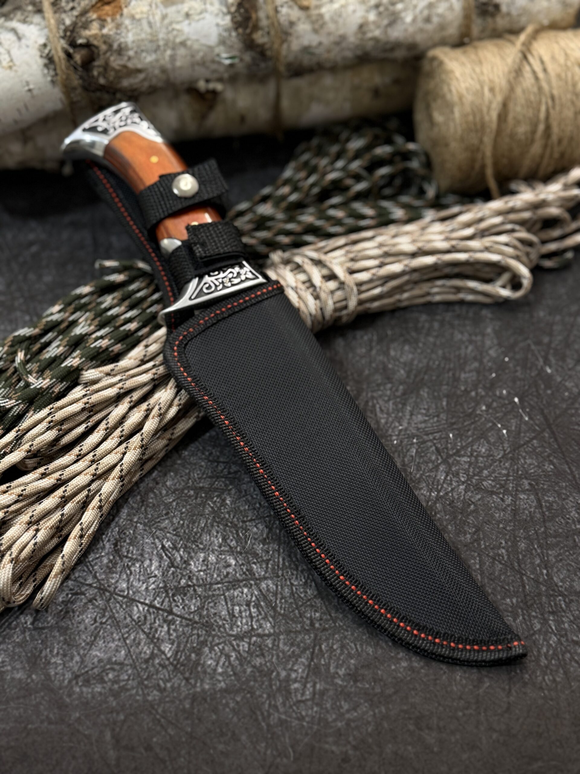 Товстий у обусі клинок витримує великі поперечні навантаження. У комплекті посилені кордурові піхви з вологовідштовхувальним покриттям, прошиті особливо міцними нитками.