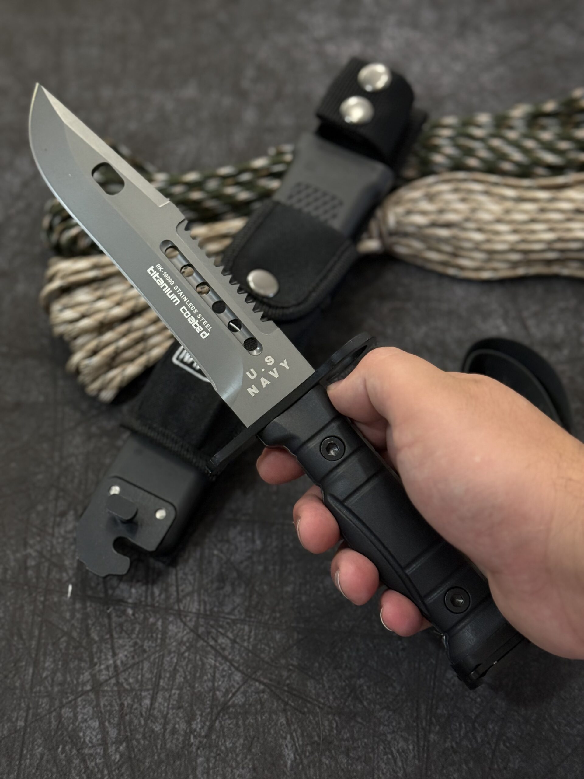 Combat Navy поєднує агресивний дизайн і універсальність використання: він однаково добре підходить для тактичних завдань, виживання, мисливських і туристичних потреб. Ергономічна рукоять забезпечує впевнений хват, а чохол із міцного АБС-пластику захищає ніж та робить його зручним у носінні.